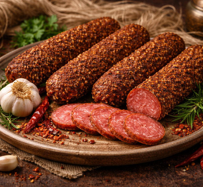 Lezzet tutkunları için özenle hazırlanan Varyant Sucuk, seçilmiş kaliteli etlerin geleneksel yöntemlerle işlenmesi ve özel baharat karışımıyla harmanlanmasıyla elde edilir. Kendine özgü aroması; sarımsak, kırmızı biber ve doğal sucuk baharatlarının dengeli birleşimi sayesinde yoğun ve doyurucu bir lezzet sunar.